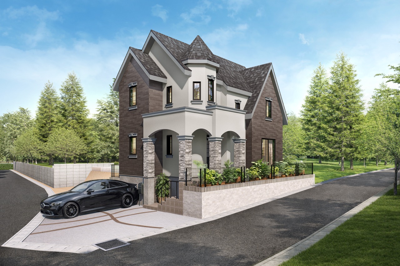 2階の「塔屋」をアクセントにした、遊び心と気品が調和する外観デザイン。 街並みの中で「ハッと」目を惹く塔屋は、ただの飾りではなく、この家を象徴する大切なピース✨ 塔屋の他にも「尖り屋根」で視線を上に誘導することにより、建物を堂々と大きく見せられます!