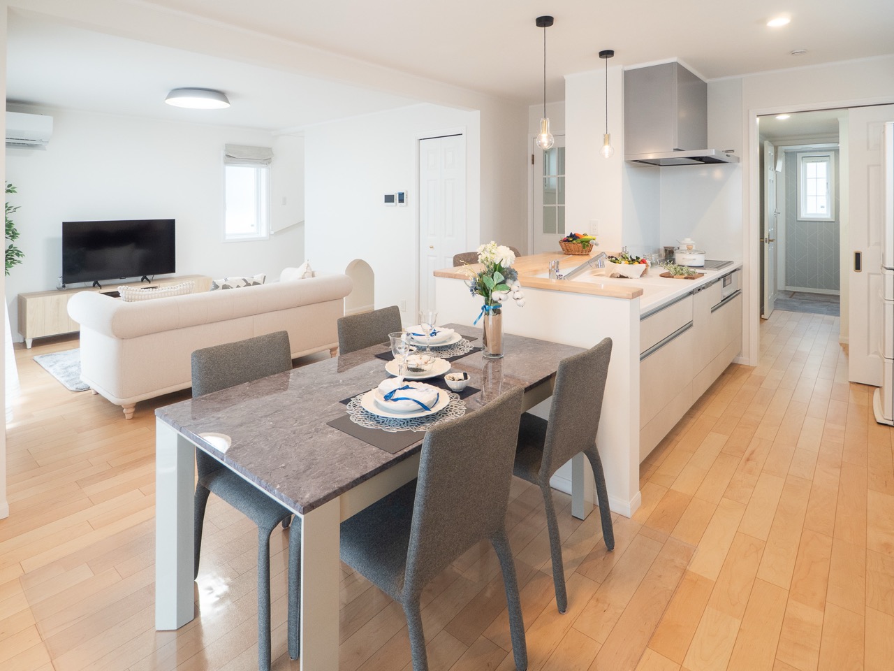 行き止まりのない「回遊動線」が、毎日の家事をスマートに短縮。 そして、視界が抜けるフラットキッチンと横並びダイニングを組み合わせが、限られた広さを感じさせない開放的なLDKを実現。 籠られた空間を快適になるようにこだわった設計が、ゆとりある家族の時間と機能美を両立させます!