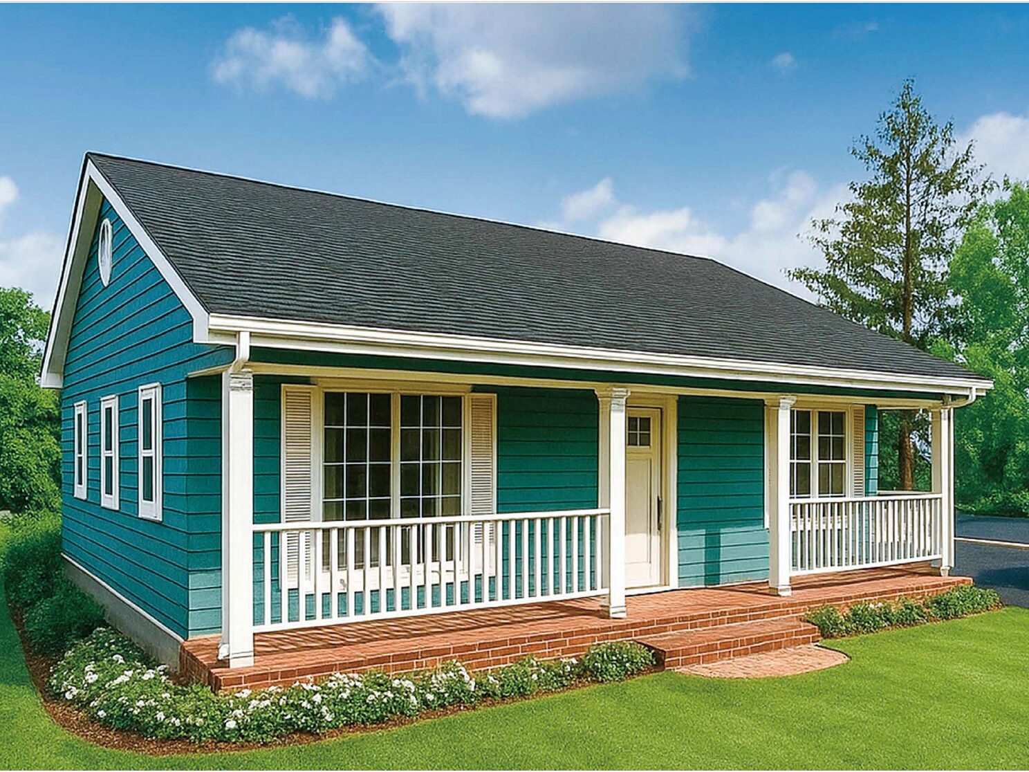 鮮やかなグリーンのラップサイディングに、ゆったりと佇むカバードポーチ。