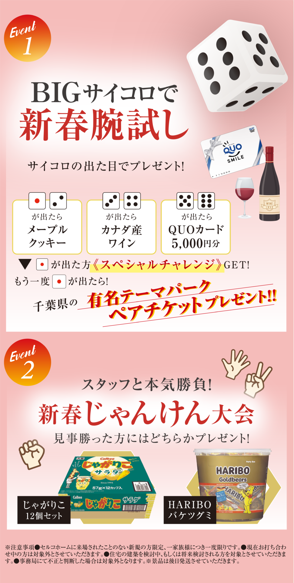 有名テーマパークペアチケットが当たるサイコロでの運試し、スタッフとのじゃんけん大会、注文住宅成約の方に100万円分オプションプレゼントといった企画が盛りだくさん♪